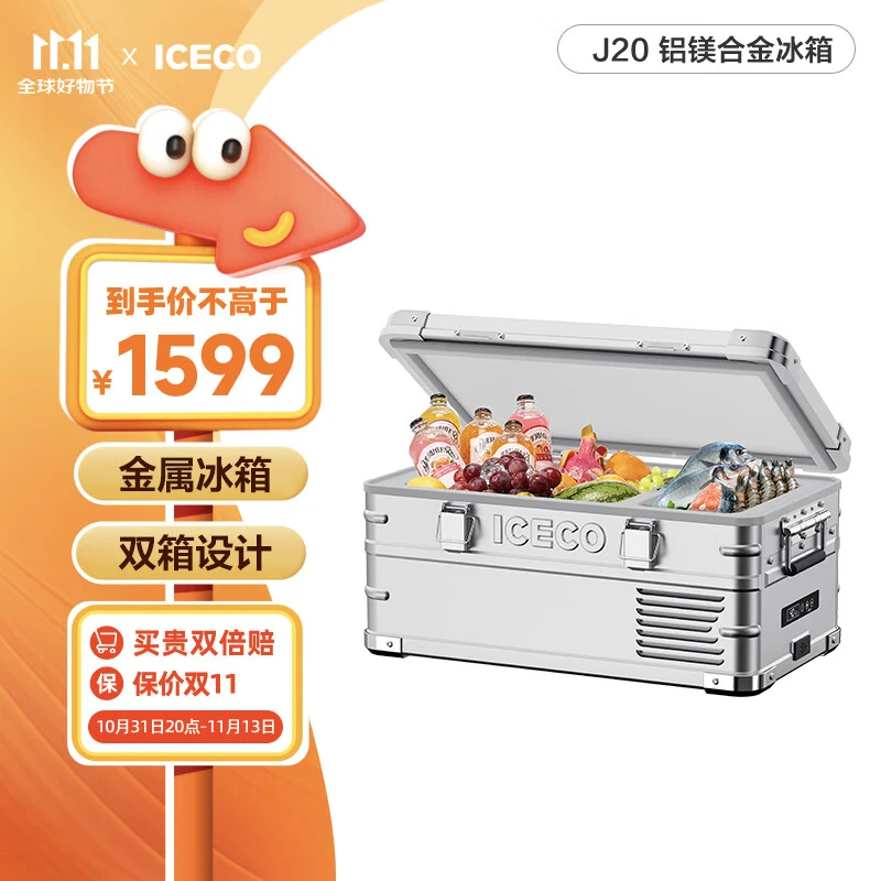 ICECOJ20L车载冰箱,以其20L的容积和精致的铝镁合金箱体,成为户外露营的理想之选。冰箱的重量仅10.4KG,相比铁质材料轻便了3倍,便携性极佳。其低至32分贝的噪音,保证了在车或帐篷中休息时不受打扰。冰箱的尺寸为636*379*294mm,能轻松容纳330ml可乐、550ml饮用水和750ml红酒,满足不同需求。