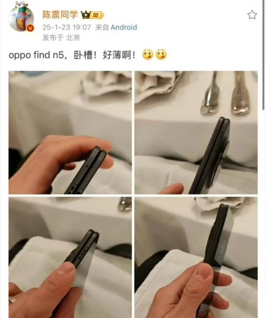 日前,多位博主发文称车评人陈震疑泄露 OPPO Find N5真机照片,引发关注。