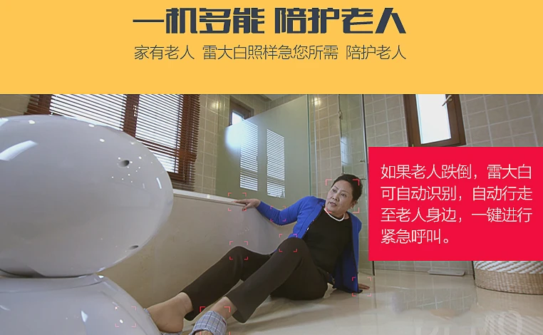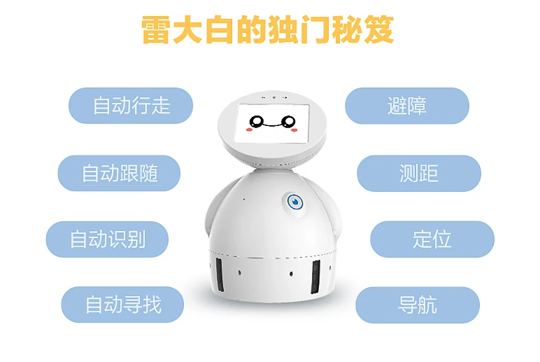 作为一款陪伴型机器人,雷大白可以自动跟随孩子或者老人,在家看护孩子的一举一动、老人的行动安全以及家里的安全状况,当然也可以用于跟踪宠物,如果家里有意外情况发生,雷大白会主动联系主人,实施救助。如果家长长时间出差或者上班时间想念孩子,雷大白可以与主人的手机建立连接,快速建立视频通话,并在视频的过程中一键设定拍摄,记录孩子成长的每一天。