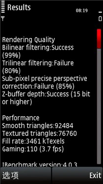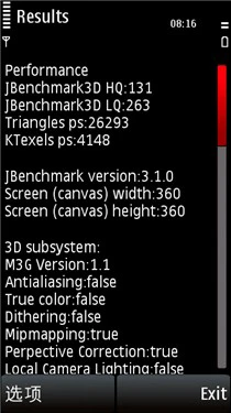 从上面的截图中我们就能看出来,诺基亚5530XM在硬件测试分数方面有着非常优异的表现,基本能力皆处于诺基亚5800XM的两倍以上,部分能力更是处于5800XM 3倍以上,虽然分数上比较抢眼,但该机同诺基亚N97以及N86等等新机型一样,并不支持3D加速,3D处理能力表现堪忧。