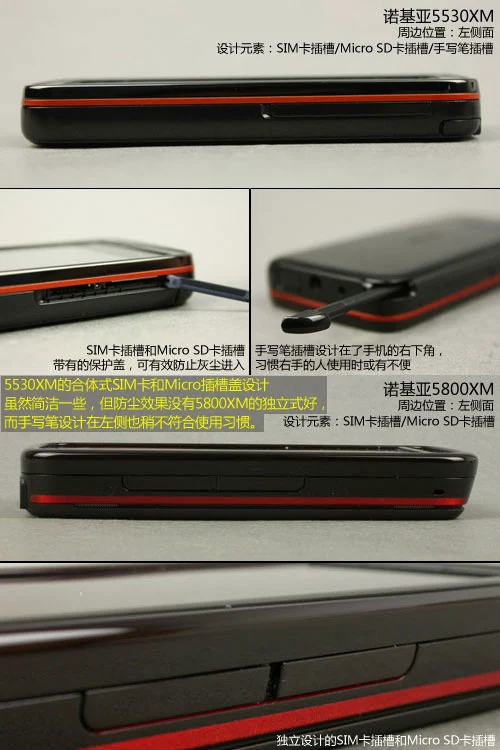 刚才已经说过,该机的SIM插槽并没有设计在手机电池仓内部,而是该机的左侧面上,而且该机也没有采用半自动式设计,因为拆卸手机SIM的时候需要手写笔这样的辅助工具来帮忙更换SIM卡。回头再来看一下该机的整体外观,我们很容易就能看出来诺基亚5800XM的风格在里面,但我们也能够看出来诺基亚的改变,这才是最好的,不断创新不断改进才能满足人们日益增长的IT需求。
