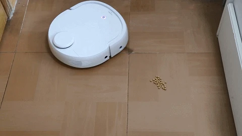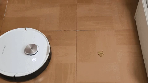 面对颗粒较大的物体,科沃斯超能王可以通过边刷、滚刷和吸尘口可以将黄豆全部吸入没有残留和打飞的现象;云鲸可能是由于产品设计的边刷间距较小,黄豆在清扫过程中被打飞了,不过最后还是可以将黄豆全部吸干净,翻过云鲸的主机再看发现,有一半的黄豆在外面,所以这样来看,滚刷的设计还是非常重要的。