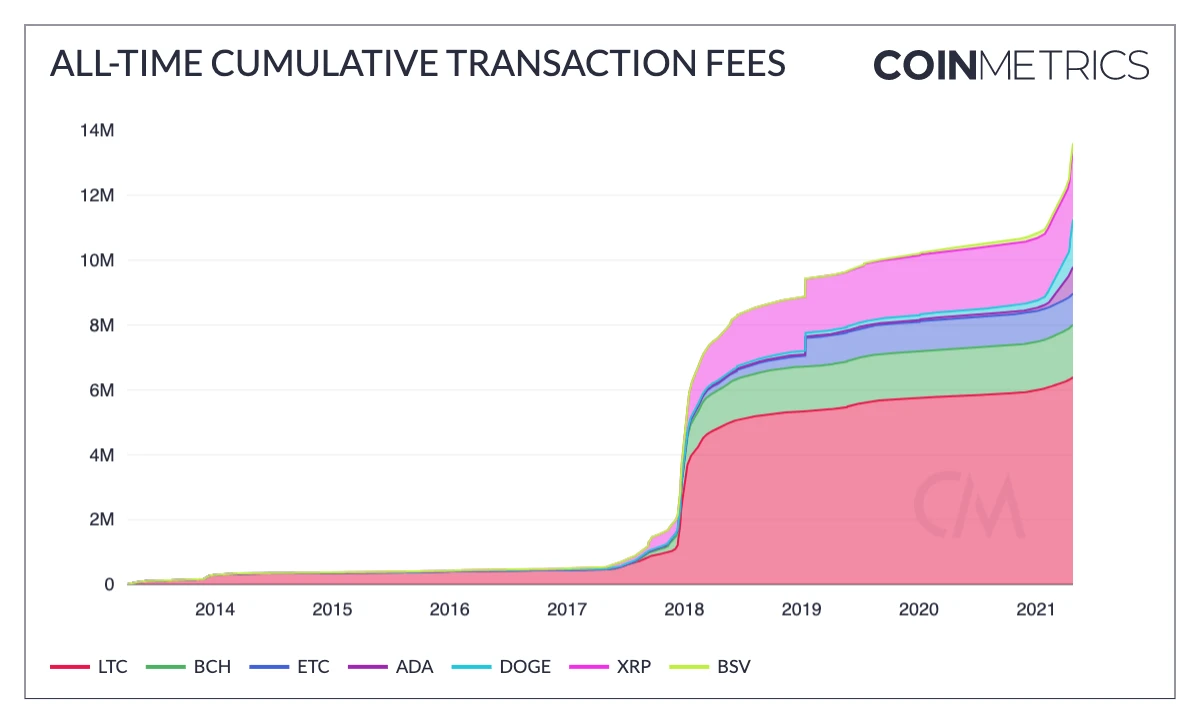 莱特币(LTC)、比特币现金(BCH)、以太坊经典(ETC)、艾达币(ADA)、狗狗币(DOGE)、瑞波币(XRP)和比特币SV(BSV)产生的交易费用总和为1360万美元。