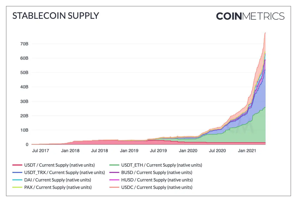 稳定币的总供应量预计将在2021年底前超过100亿。