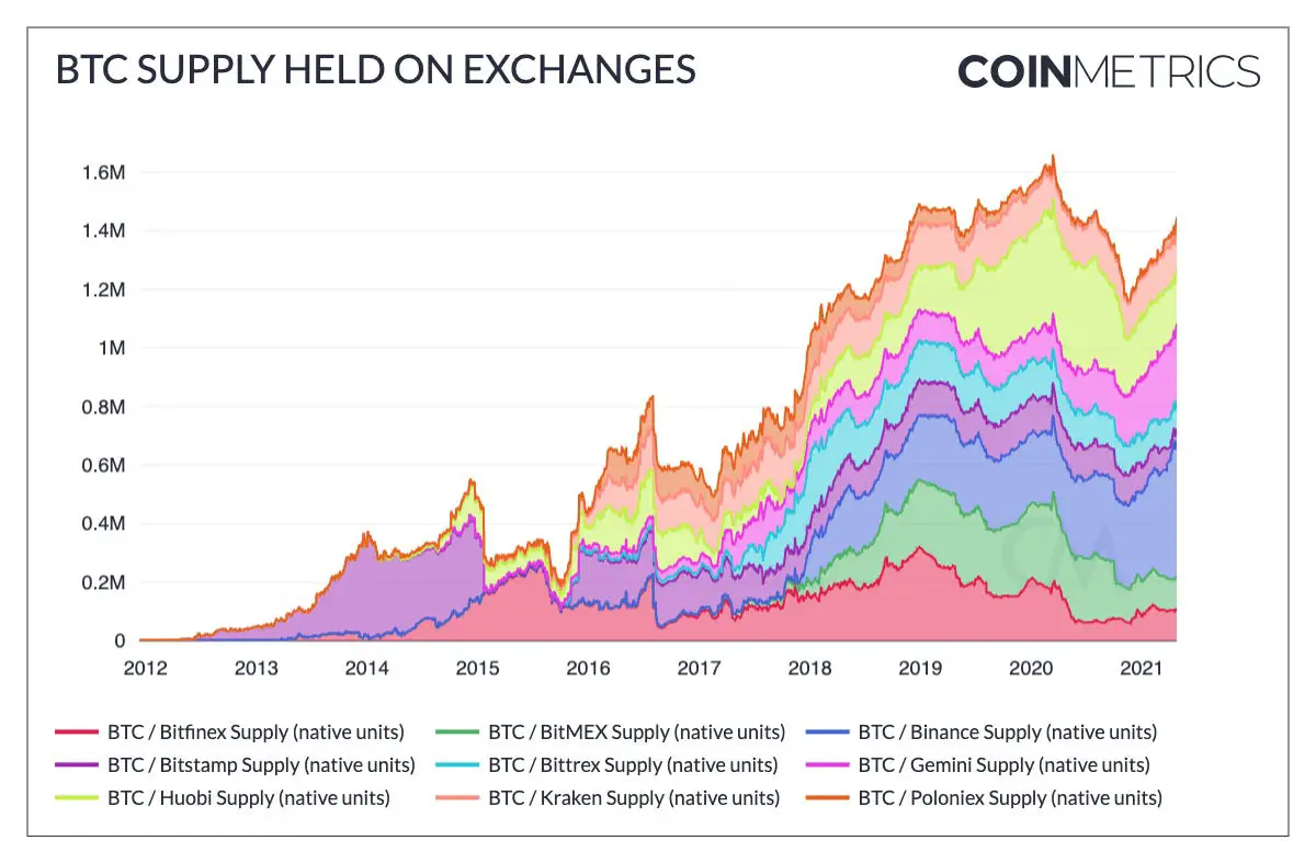 在2020年3月12日,中心化交易所持有的比特币数量达到了169万的高峰。