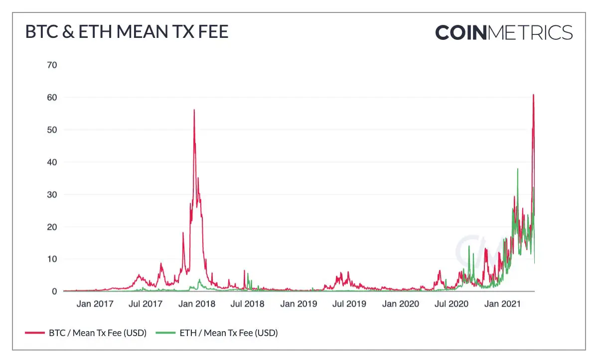 比特币平均交易费用在2021年4月20日达到60.95美元,创下最高纪录。