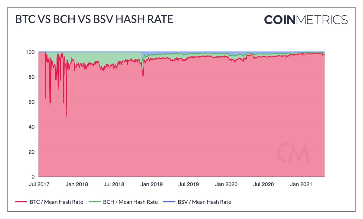 比特币占比特币、比特币现金和比特币SV矿工产生的总哈希率的约98%。