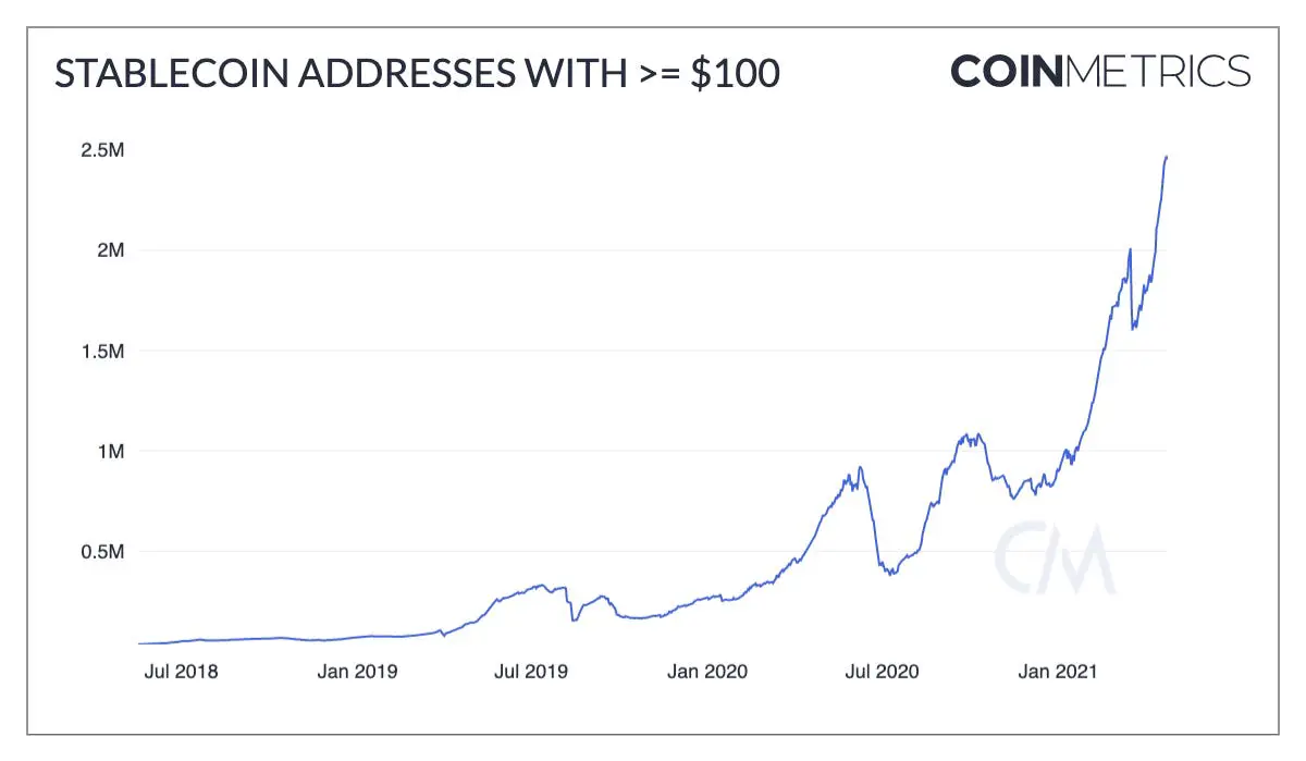 目前有超过245万个地址持有至少100美元的稳定币,较一年前的633,950个有所增加。
