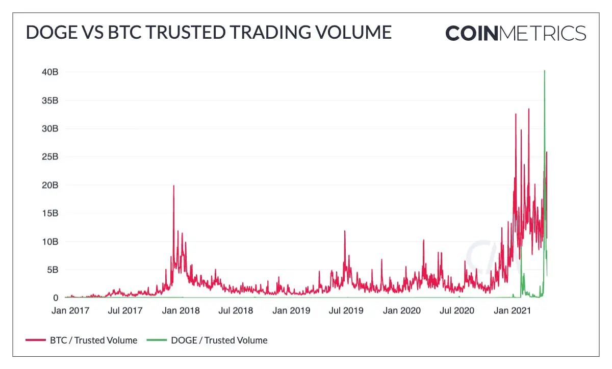 DOGE在2021年4月16日的信任交易量超过了400亿美元,超过了比特币的历史最高记录。
