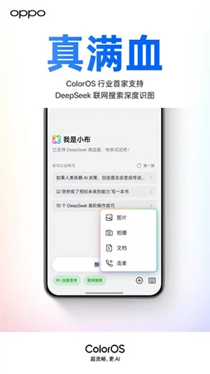 3月19日,ColorOS率先在手机行业实现DeepSeek联网深度识图与文档识别功能;3月21日完成50+款机型的全量覆盖。升级完成后,通过长按电源键开启或语音唤醒小布助手,用户可以跨应用、多模态识别手机屏幕上的文字及图片信息,并结合联网搜索进行深度思考,带来更加便捷、实用的AI体验。