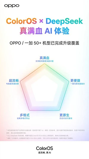 2月26日起,ColorOS全面接入满血版 DeepSeek-R1,支持一键 AI 唤醒、语音对话交互、联网搜索、生成结果导出,以及本地化的网络部署;3月10日,ColorOS进一步升级,新增「一键问屏」直接调用DeepSeek联网深度问答,同时升级了更原生的历史记录查询功能,进一步提升用户体验;至3月21日,ColorOS实现了多模态识图及文档识别的突破。OPPO的创新不止于简单接入DeepSeek,更是通过多方努力将其与ColorOS深度融合,为用户带来前所未有的AI体验。通过每次更新,OPPO持续赋能用户,真正实现ColorOS「月月有更新,越用越好用」的持续进化。