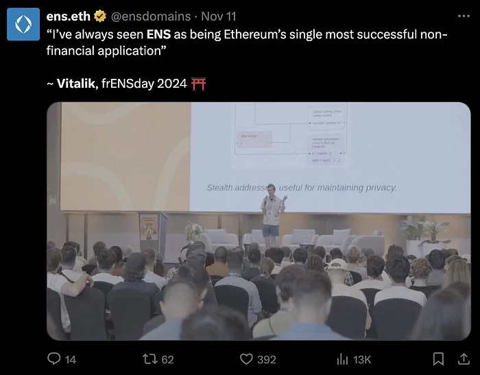 Vitalik:「ENS一直是我認為以太坊上最成功的非金融應用」。