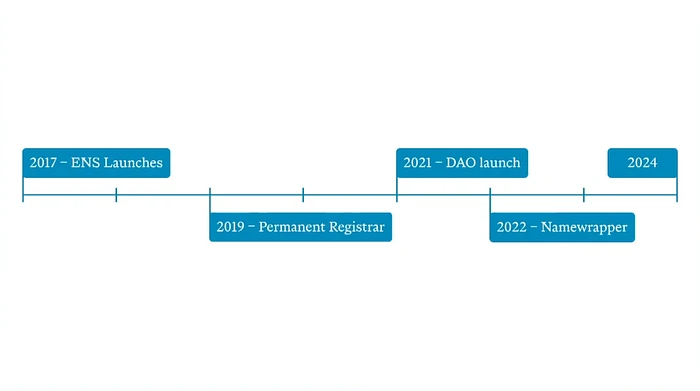 相信在 2024 的今天,大多數以太生態系的朋友們,都已經熟悉甚至擁有自己的 .eth 名字。不過 ENS 能夠有今天的普及率,實際上是一路走來,團隊与 DAO 不間斷努力的結果。從誕生至今,ENS 經歷了這些重大里程碑: