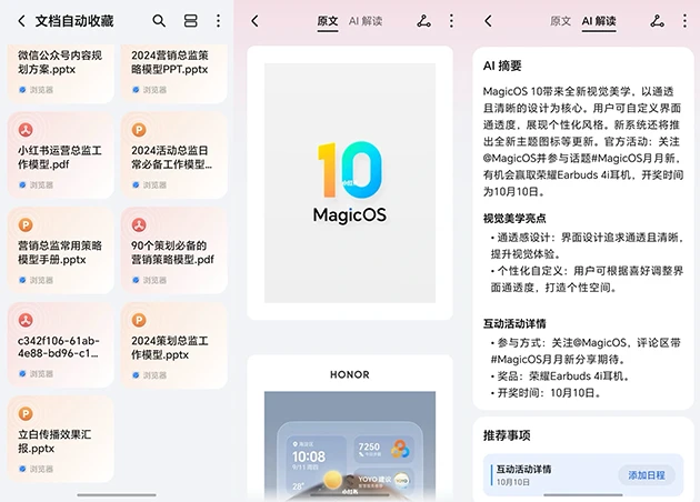 据内测用户在公共领域的讨论,升级至MagicOS 10后,系统新增十余项AI功能。其中作为专属个人知识库的 “YOYO记忆”的升级尤为亮眼。升级后的YOYO记忆在原有收藏空间基础上,支持“随心记”、“安心管”、“贴心用”,化身更全能的随身助理,帮助用户提升信息存储、编辑、管理效率。