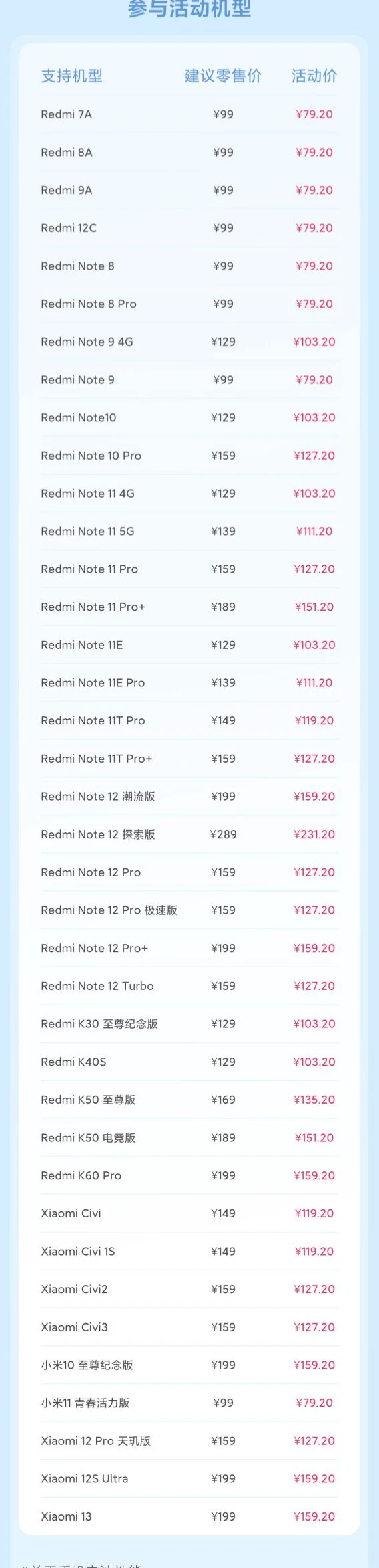Redmi 7A、Redmi 8A、Redmi 9A、Redmi 12C、Redmi Note 8、Redmi Note 8 Pro、Redmi Note 9 4G、Redmi Note 9、Redmi Note10、Redmi Note 10 Pro、Redmi Note 11 4G、Redmi Note 11 5G、Redmi Note 11 Pro、Redmi Note 11 Pro+、Redmi Note 11E、Redmi Note 11E Pro、Redmi Note 11T Pro、Redmi Note 11T Pro+、Redmi Note 12 潮流版、Redmi Note 12 探索版、Redmi Note 12 Pro、Redmi Note 12 Pro 极速版、Redmi Note 12 Pro+、Redmi Note 12 Turbo、Redmi K30至尊纪念版、Redmi K40S、Redmi K50至尊版、Redmi K50电竞版、Redmi K60 Pro。