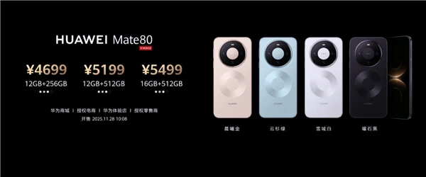 具体来看,华为Mate 80 12GB+256GB 4699元,12GB+512GB 5199元,16GB+512GB 5499元。