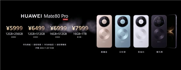 华为Mate 80 Pro 12GB+256GB 5999元,12GB+512GB 6499元,16GB+512GB 6999元,16GB+1TB 7999元。
