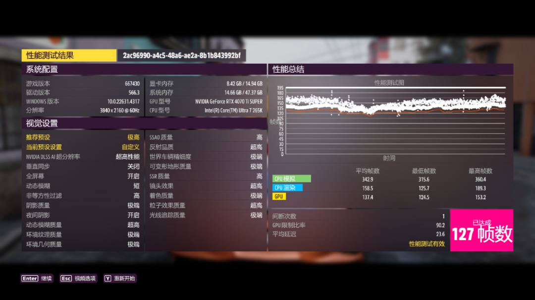 《极限竞速·地平线5》游戏基准测试,极端画质,极端光追,开启DLSS 3.0并设为超级性能模式,4K分辨率下,游戏平均帧数127 FPS;