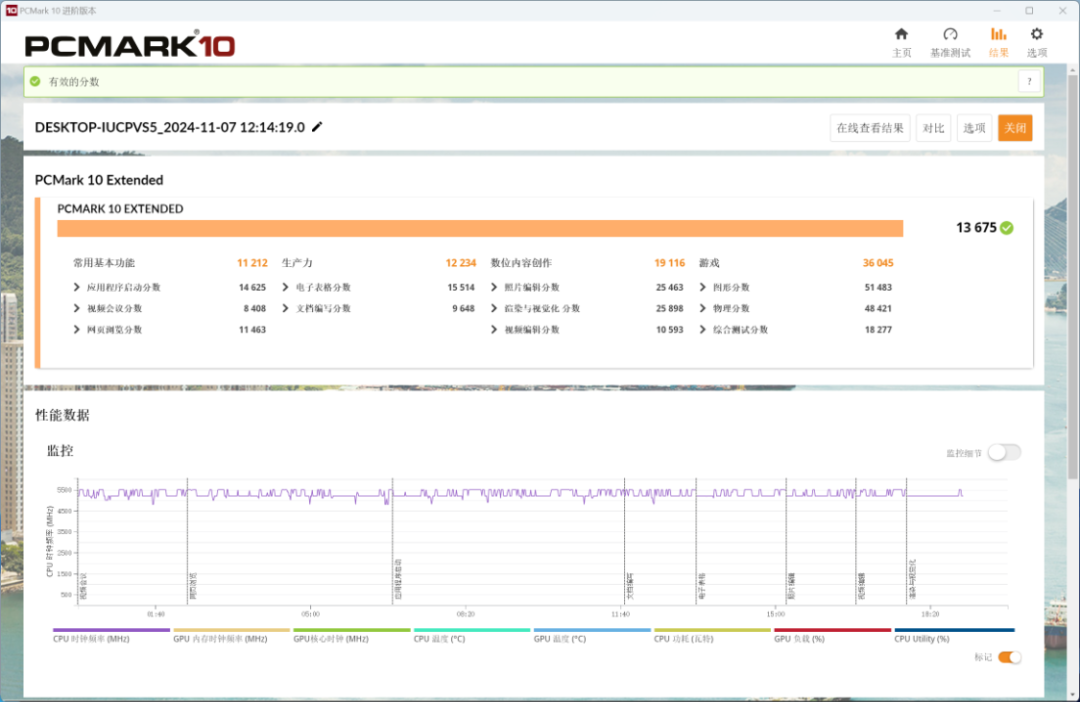 PC Mark Extended整机测试,整机得分13675分,常用基本功能得分11212分,生产力得分12234分,数为内容创作得分19116分,游戏得分36045分;