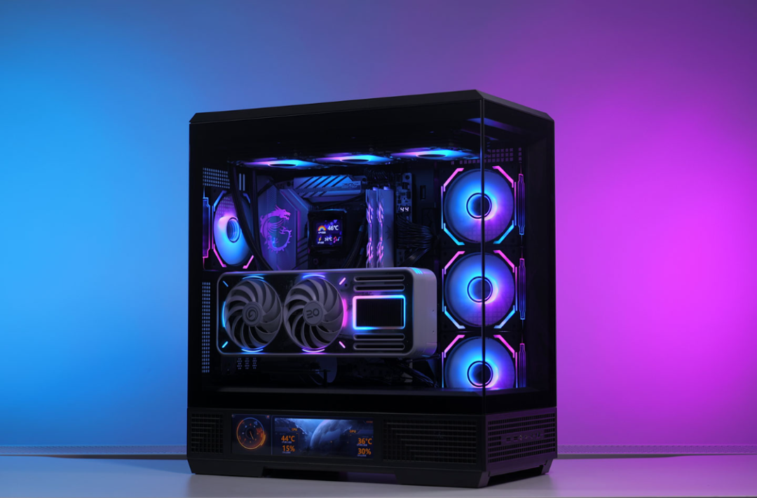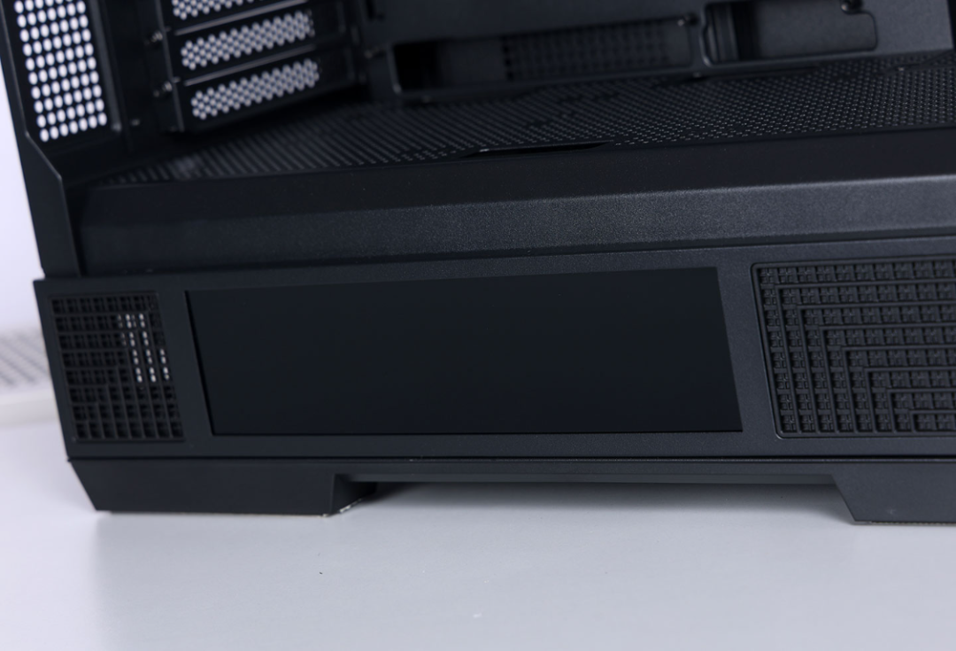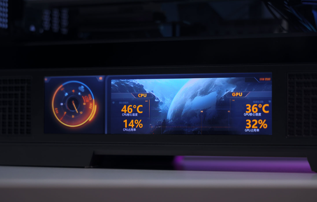 电源仓外侧,一块9.16英寸大小的高清显示屏,屏幕分辨率为1920*462,通过机箱配套的控制软件,屏幕可以识别并实时显示电脑的硬件型号以及硬件状态信息,玩家可以将JPG/PNG图片或MP4视频上传至屏幕中,自定义设计屏幕显示的内容。同时,软件中还内置了4款不同风格的主题。