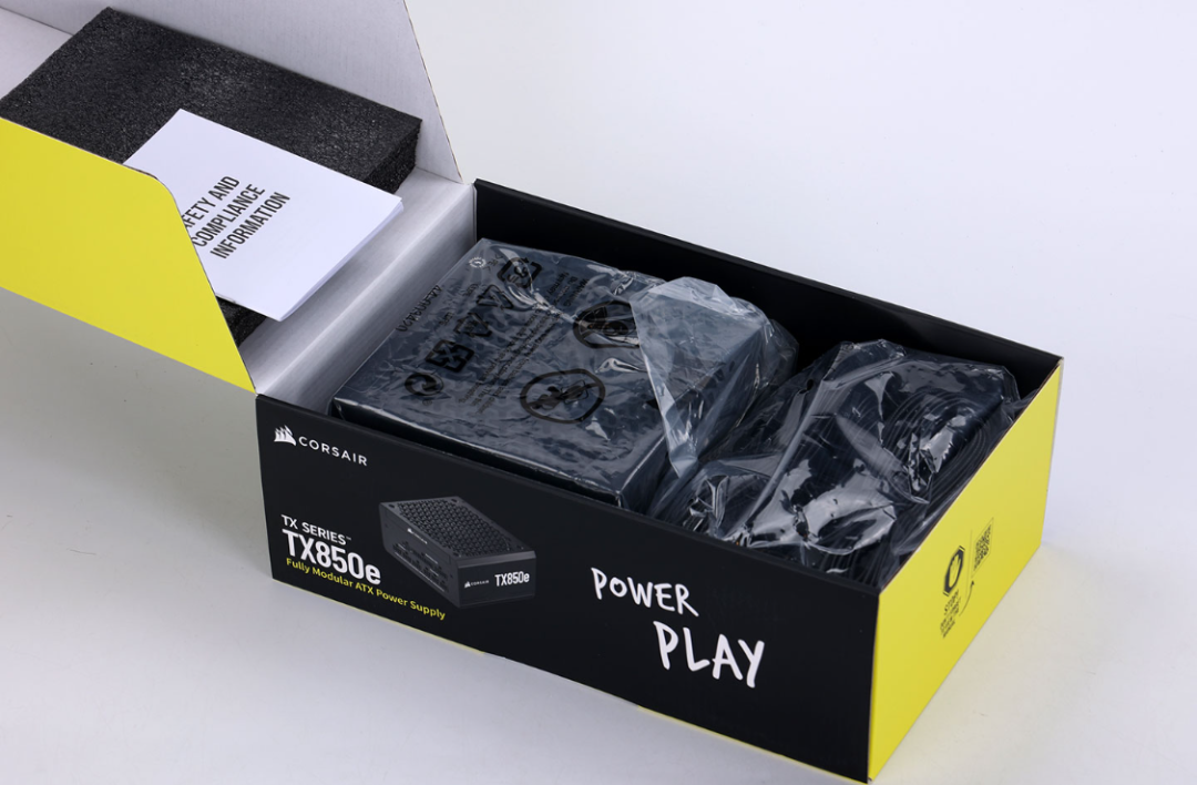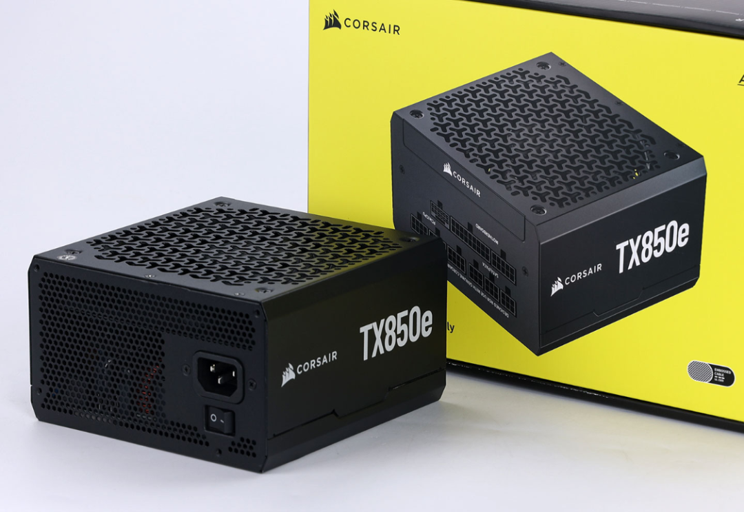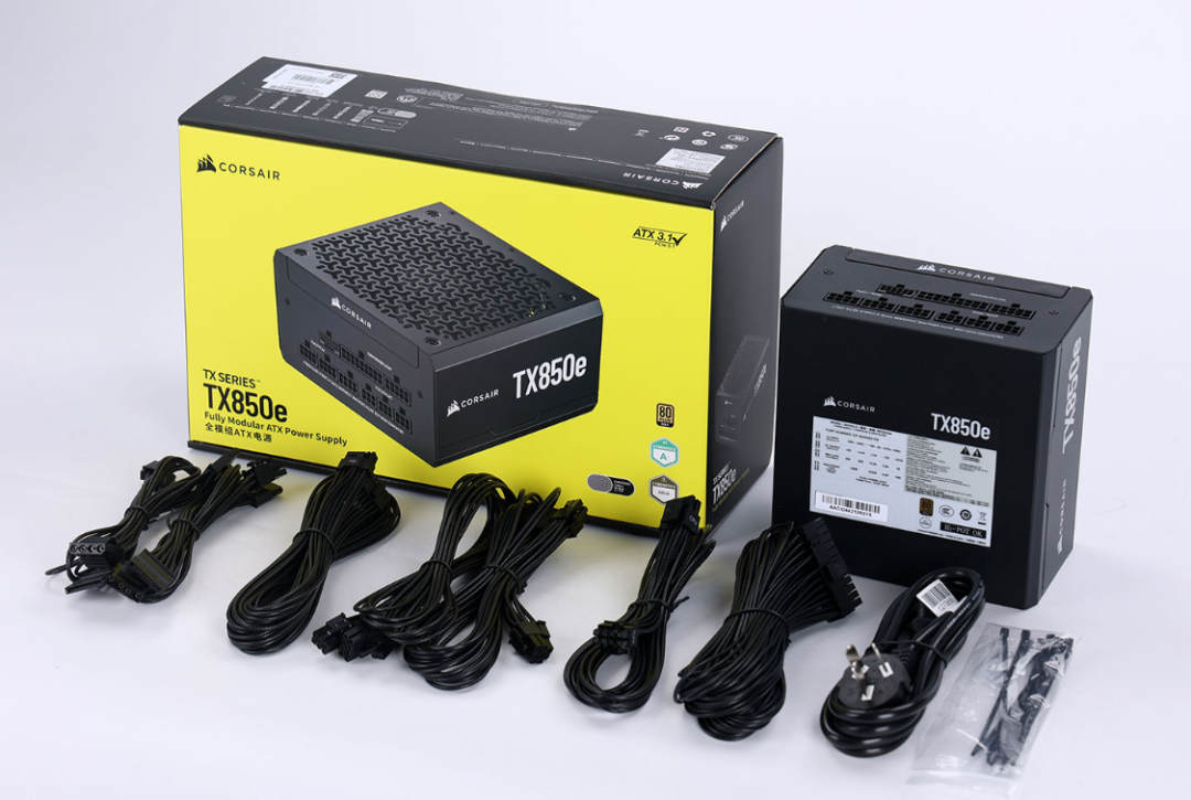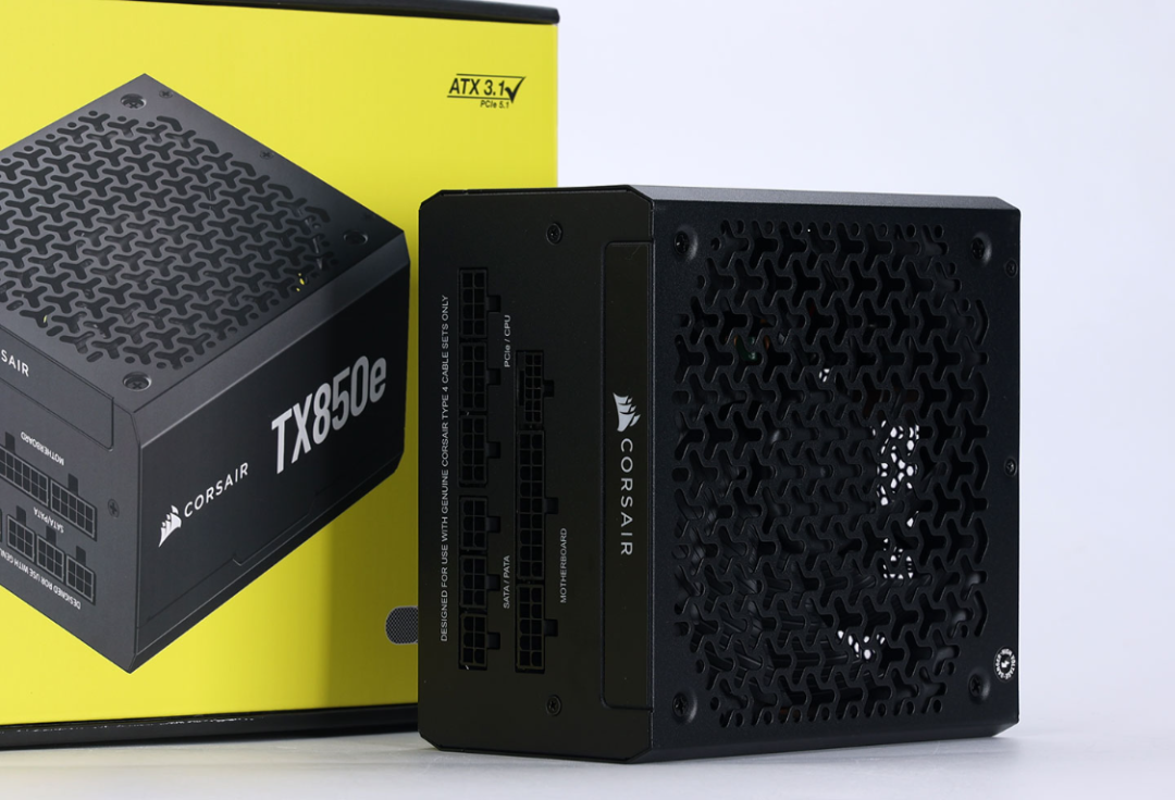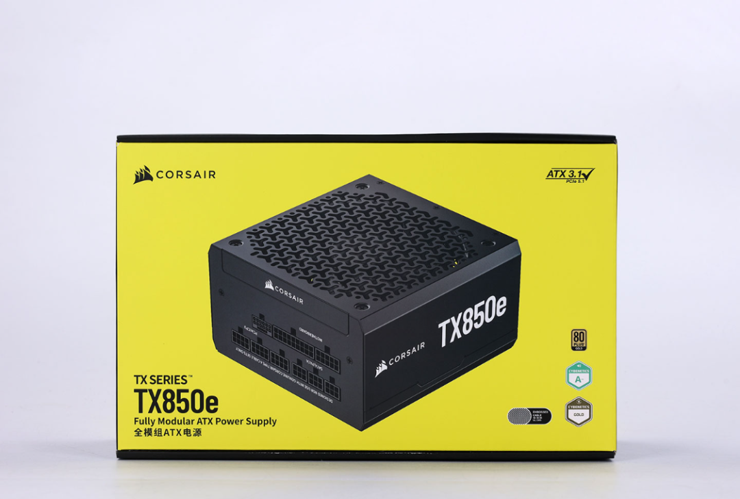 全新的酷睿U7搭配4070TiS显卡,功耗需求不低,但850W完全够用。今儿装机使用的是美商海盗船的TX850e ATX3.1金牌全模组电源。熟悉的黄黑撞色外包装,辨识度直接拉满。