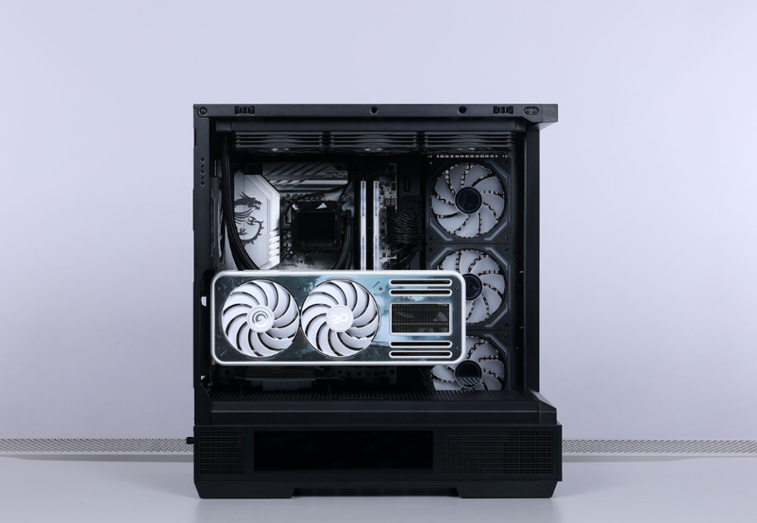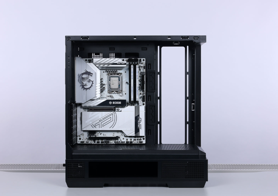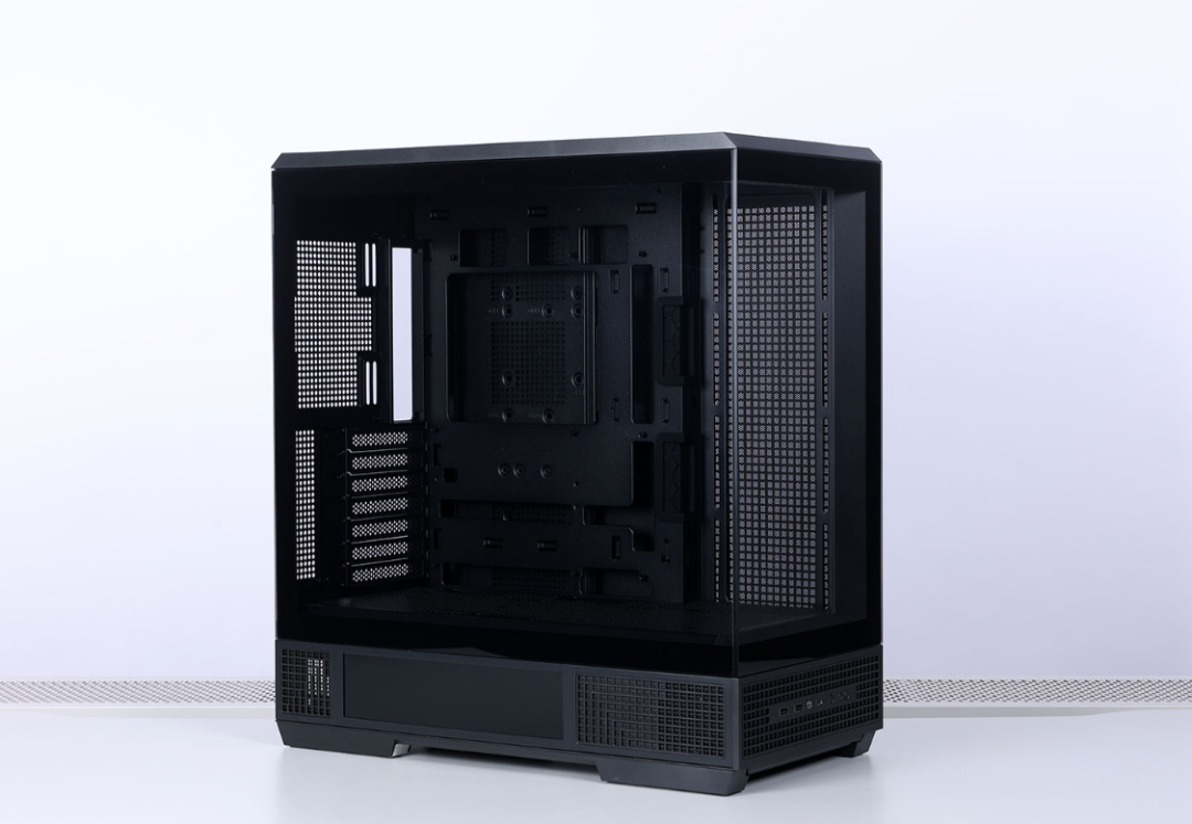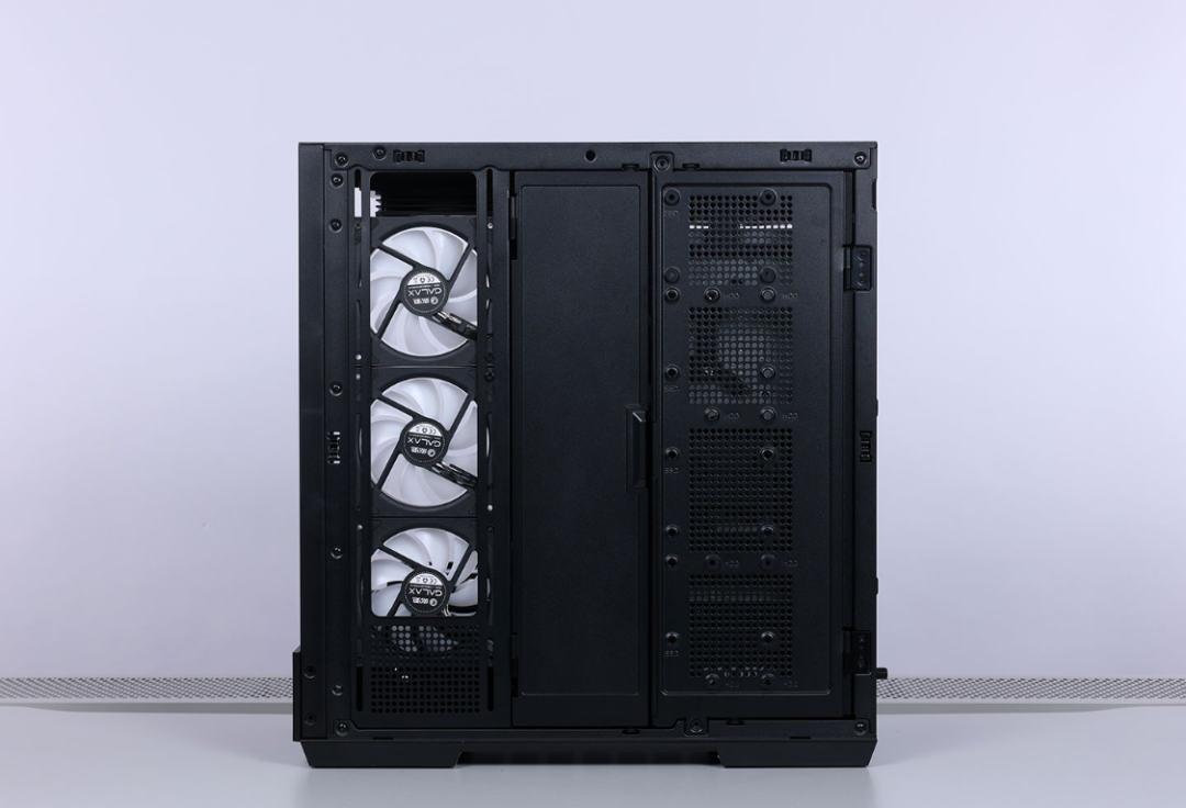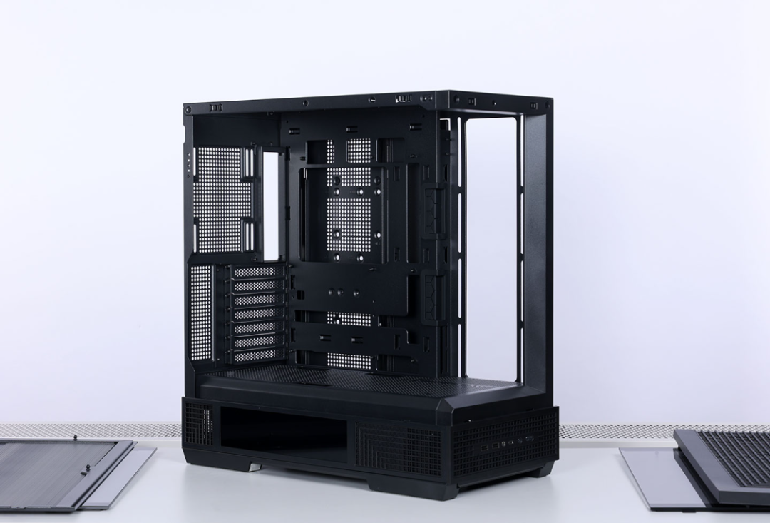 机箱采用4面快拆设计,两块侧板、顶部与前面板均采用球形卡扣 + 卡榫的结构进行固定,拆装都非常方便。兼容性方面,最大支持ATX主板安装,风冷安装限高185mm,支持顶置或侧置安装360冷排,最大支持10把120mm散热风扇。显卡安装限长高达400mm,模块化设计的Pcie槽可以直接切换到竖装模式。