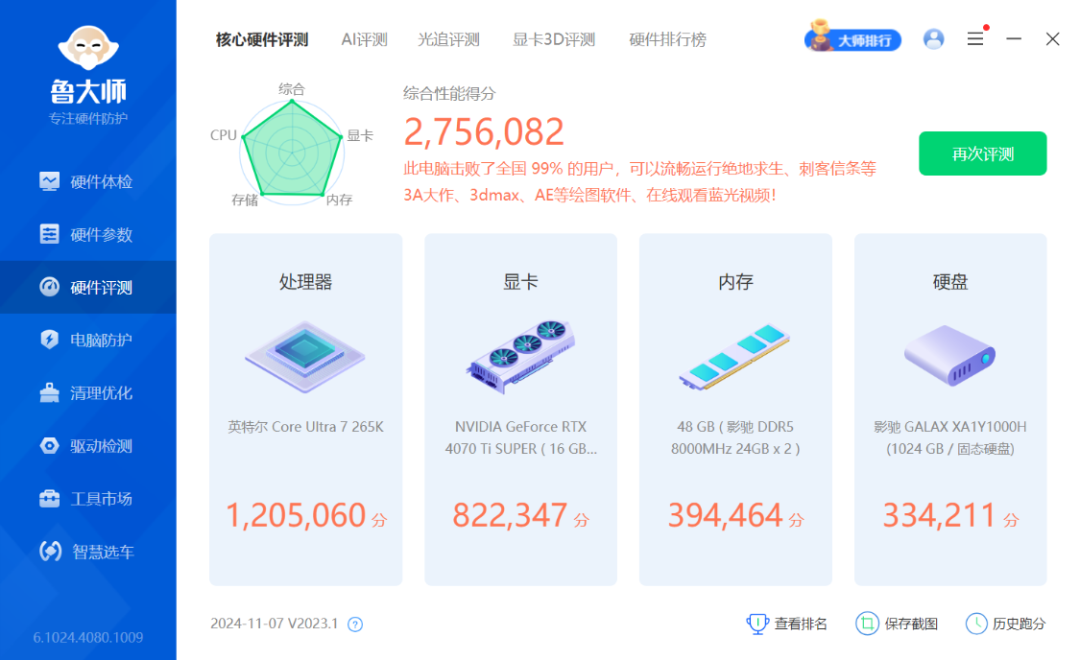 鲁大师整机测试得分275W分;