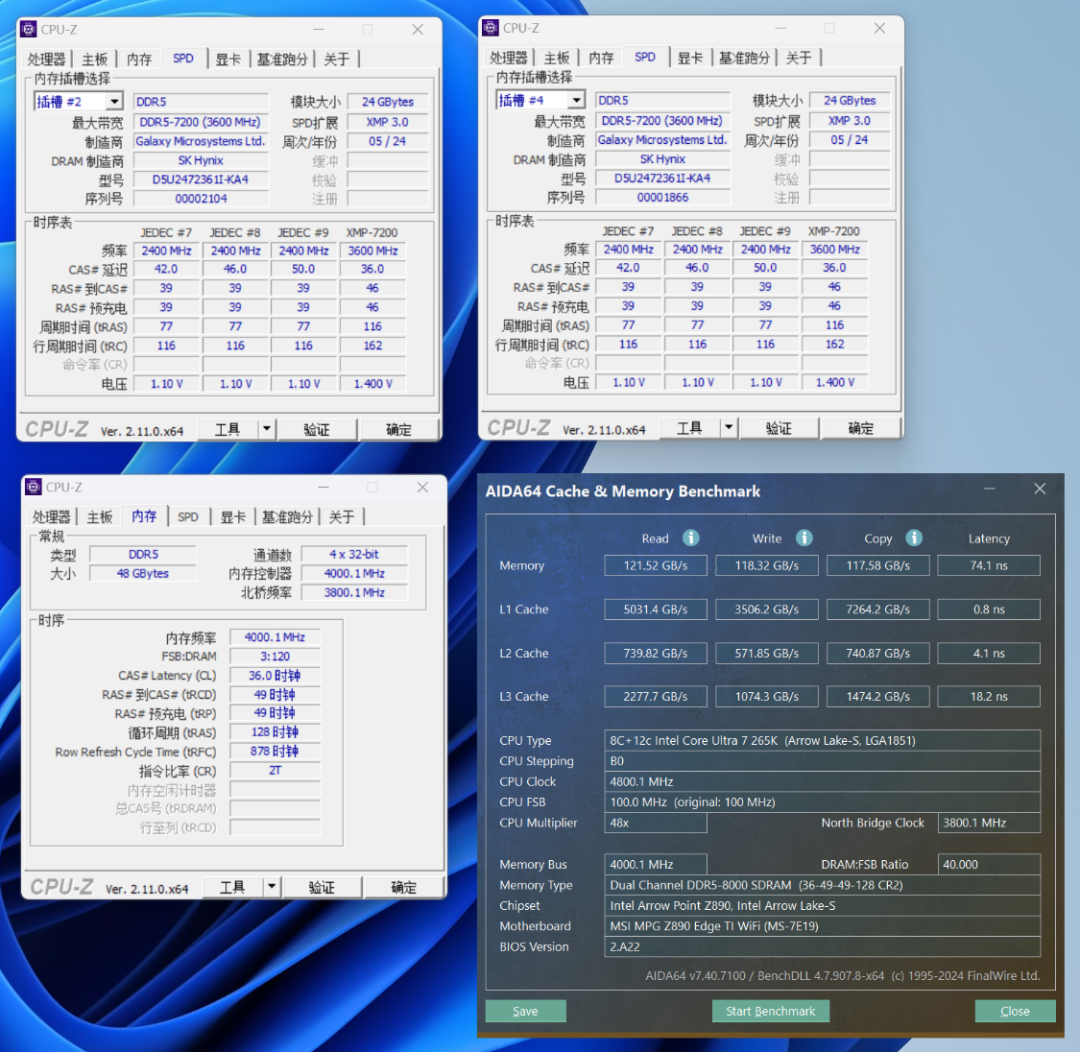 内存读写测试,使用Memory Try it将内存OC至8000MHz C36,并在Memory Extension Mode中选择Benchmark Mode,内存读取速度为121.52 GB/s,写入速度为118.32 GB/s,复制速度为117.58 GB/s,延时为74.1 ns;