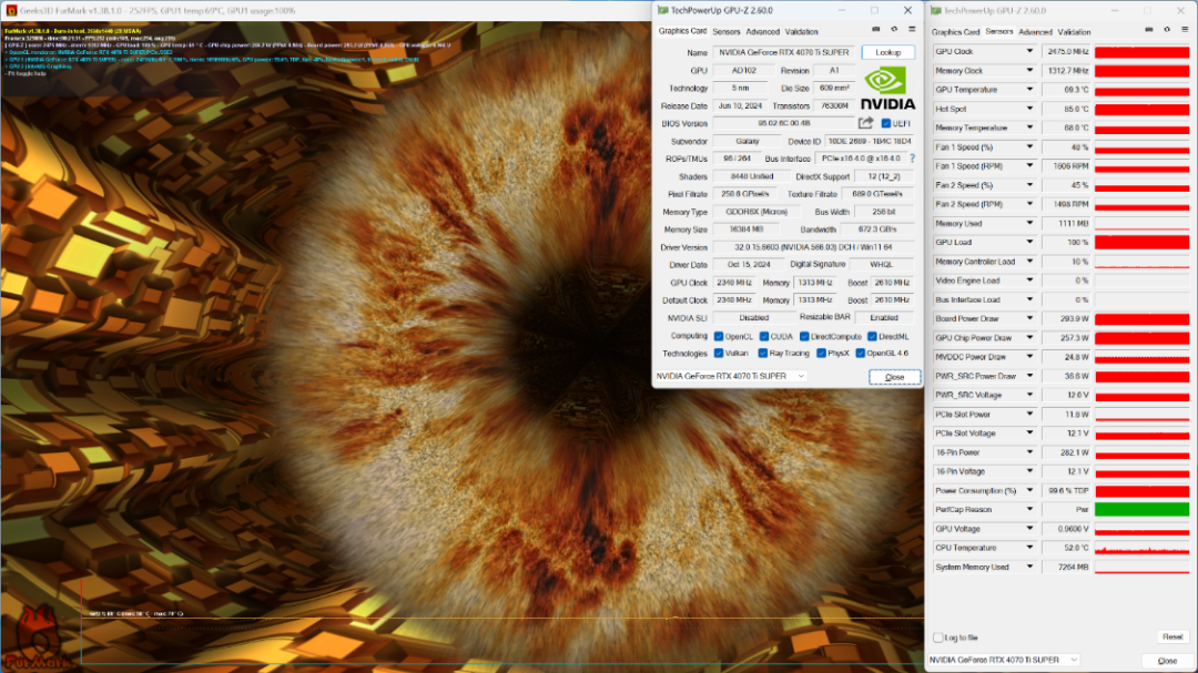FurMark烤机测试,烤机20 Min,显卡温度69°左右,显卡功耗为295W左右;