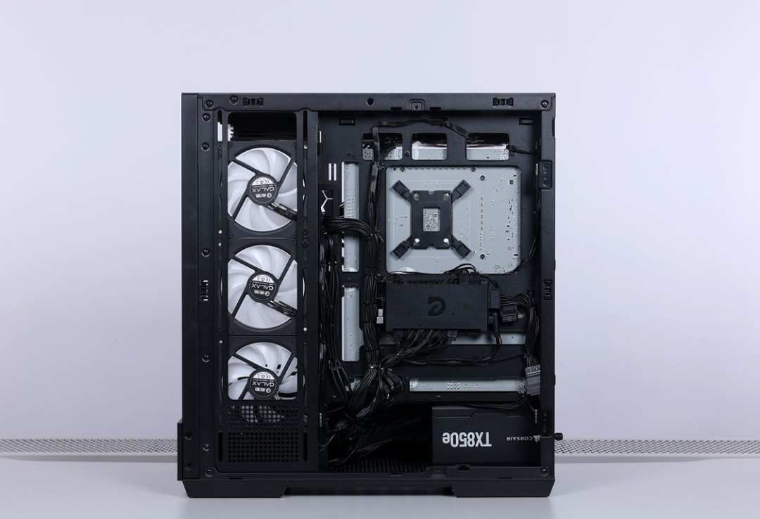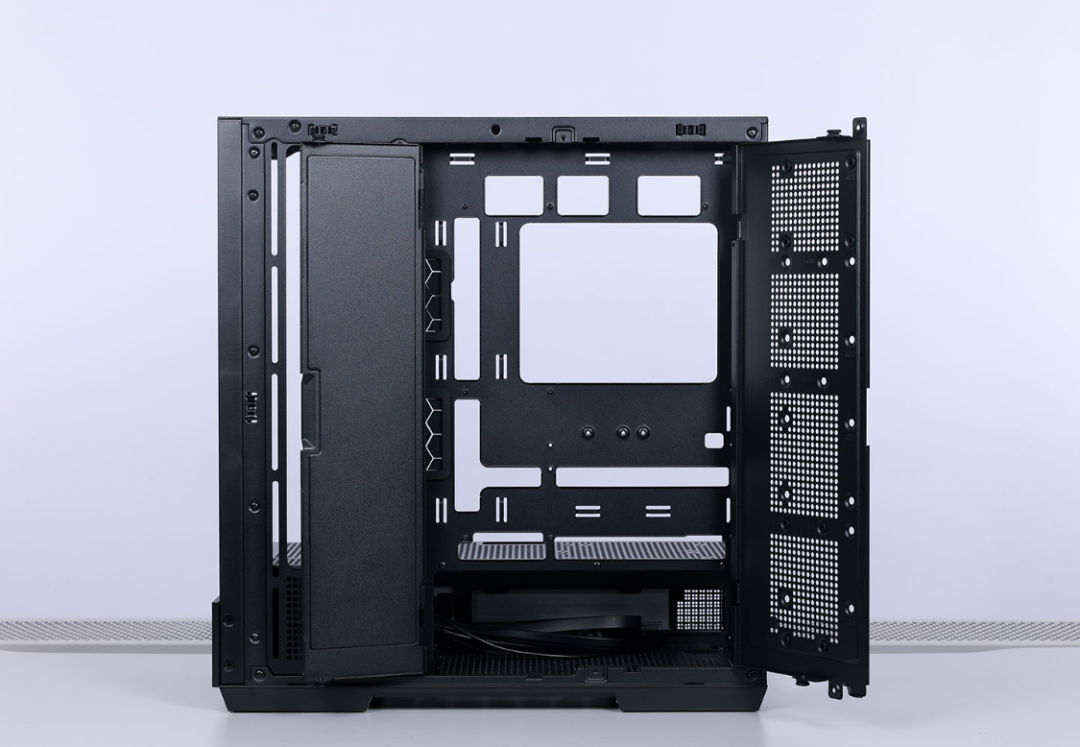 机箱背部理线空间充沛,同时还有大量扎带固定孔位以及翻门式挡线板,可以让玩家背线无忧。侧开门式的硬盘支架最多可同时安装2*3.5寸和2*2.5寸SATA硬盘,极大的提高了机箱背部空间你用效率,也降低了电源仓空间压力。最大可支持安装的电源长度在提升到了270mm,还能让电源仓中再加装1块3.5寸HDD硬盘。