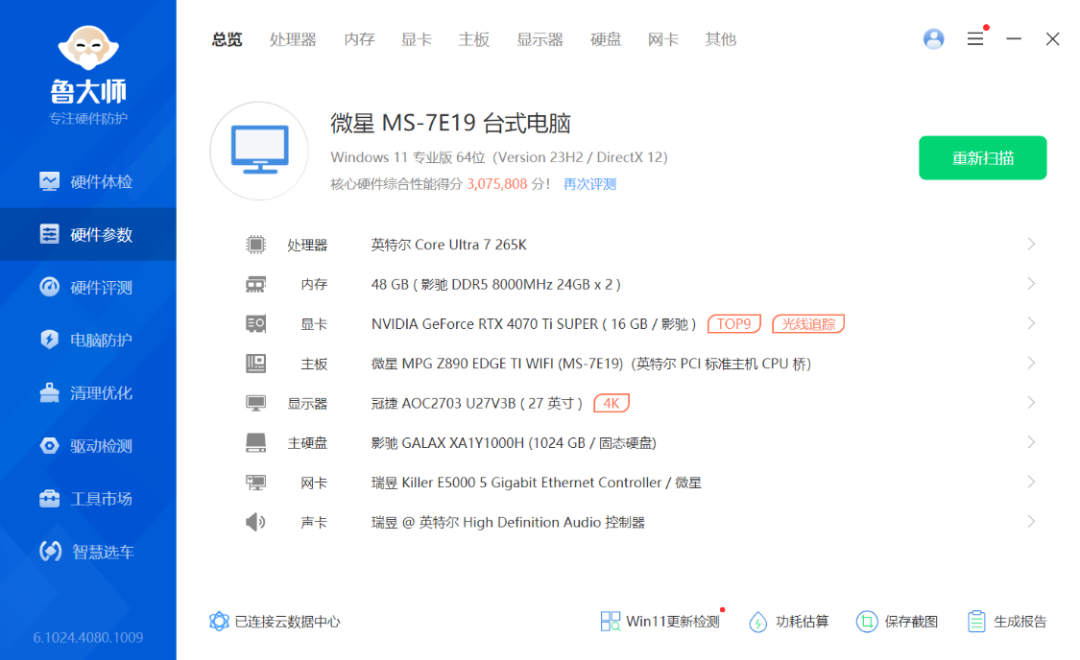 完整配置清单:Intel Ultra7-265K处理器、微星MPG Z890 EDGE Ti WIFI刀锋钛主板、影驰RTX 4070Ti Super特别纪念版显卡、HOF Extreme D5-7200MHz 24G*2内存、星曜7000Plus 1T M.2固态硬盘、爱国者星璨大岚屏显版黑色海景房机箱、影驰星曜G360黑色限定版一体式水冷、美商海盗船TX850e ATX3.1 金牌全模组电源、影驰梦境Pro 黑色散热风扇*4(3反 + 1正)...