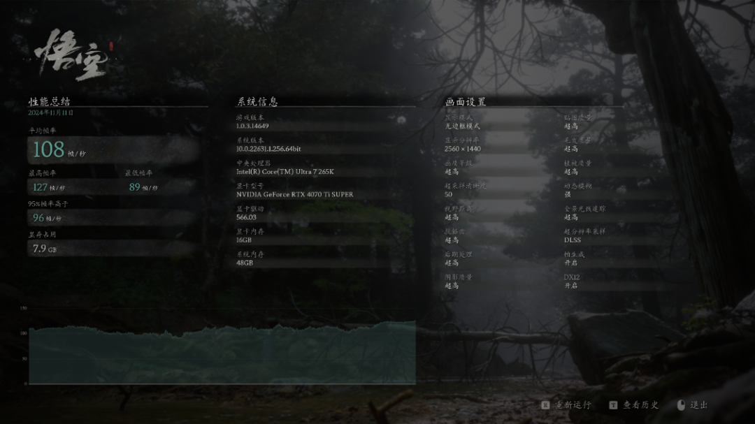 《黑神话悟空》游戏基准测试,超高画质,超高光追,开启DLSS 3.0,超采样清晰度设为50,4分辨率下,游戏平均帧数为71帧/秒。保持画质不变,只将分辨率设为2K,游戏平均帧数为108帧/秒;