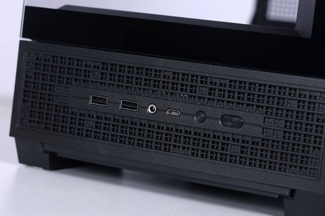 机箱I/O面板位于侧板底部,配备2个USB 3.0、1个Type-C 10Gbps数据接口、1个二合一音频口、1个开机、1个重启按钮。