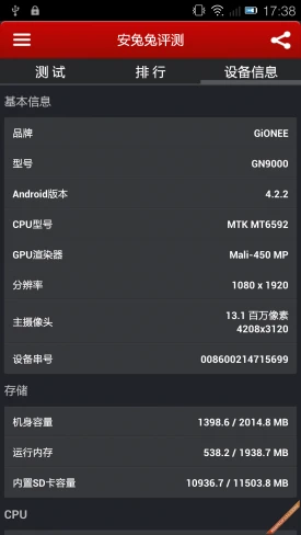 ELIFE S5.5搭载MT6592真八核CPU芯片,八颗芯片同时运行,CPU主频高达1.7GHz,拥有16G ROM+2G RAM内存组合。这种硬件组合看起来非常强悍,那么实际使用过程中又是如何呢?下面通过跑分、视频、游戏三个环节来体验。