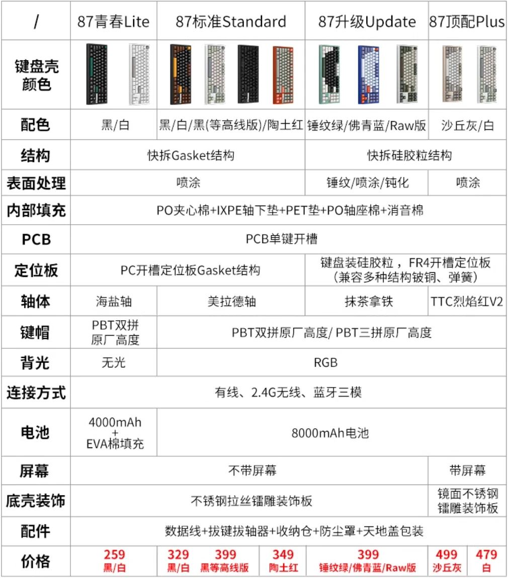 QS87一共有四个版本,11个配色。四个版本都对应不同的轴体。而我手上这个是顶配的plus版本,不过由于我拿到的是测试样机,所以它的外壳及键帽均采用青春版lite的。不过,这并不影响我们的测试,让我们进入下一步。