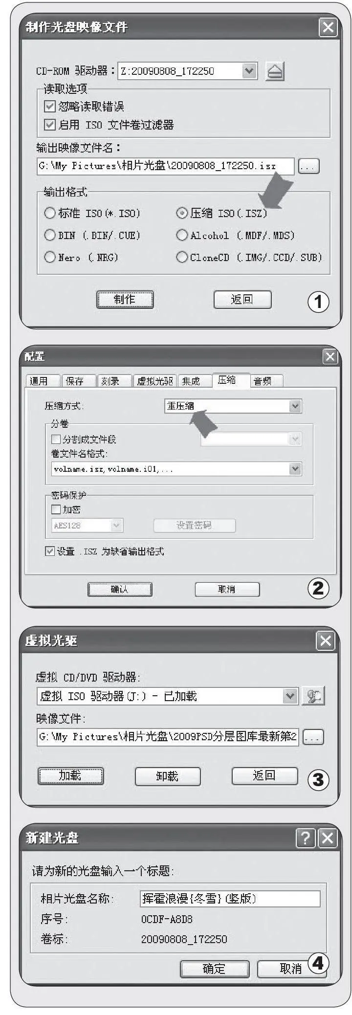 有人问为什么不在图1上选择ISO格式呢?ISO格式是一种无压缩格式,用这种格式保存光盘,还不如直接把素材光盘上的图像复制到硬盘上保存。ISZ格式是ISO格式的一种姐妹格式(大多数虚拟光驱都支持该格式),具有很大的压缩率,你可以事先在“配置”对话框(选项/配置)上设置它的压缩模式(如图2),如果选择了“重压缩”,它的压缩率可达到50%以上(4GB的DVD,压缩后还不到2GB),如果你有很多光盘需要在硬盘上保存,这种格式就是你的最佳选择。