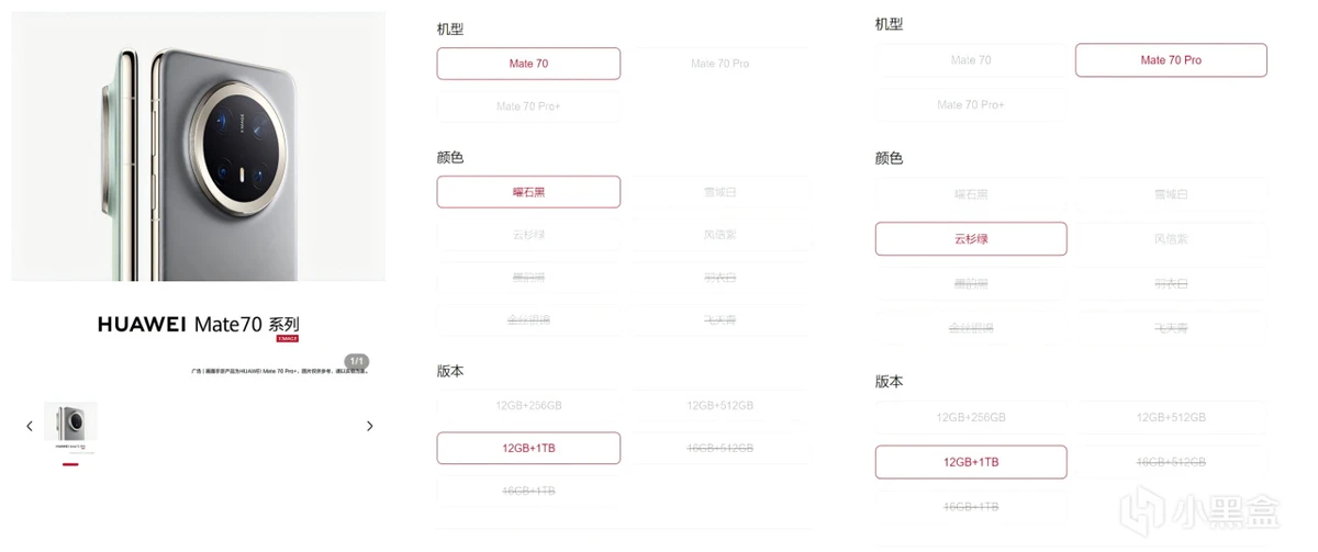 从预约界面我们看出mate70和mate70Pro机身配色保持一致,共有4种配色,分别为曜石黑、雪域白、云杉绿和风信紫。内存组合方面两款机型也保持一致,有12GB +256GB 和12GB+512GB和12GB +1TB版本可选。预估标准版5499起,Pro版6499起,具体的价格等发布会揭晓。