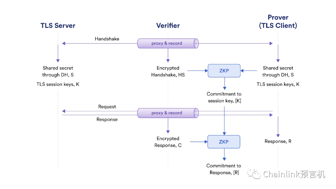证明者和验证者就密钥达成一致协议后,会持有对TLS会话密钥K做出的承诺[K]以及服务器发送的加密TLS响应C。证明者收到C(即:TLS客户端),而验证者则作为代理将其记录下来。在之后证明数据真实性的环节,C就是证明者和验证者都知晓的“事实”(truth)。