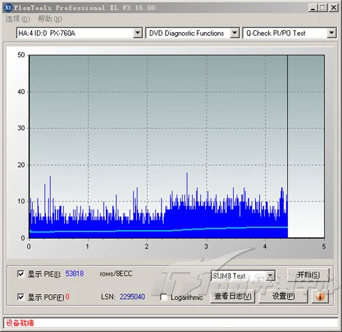 Plextor PX760A+PTP3.16报出的PIE为53818,比DW1640所测的结果低了一些,同样没有POF。