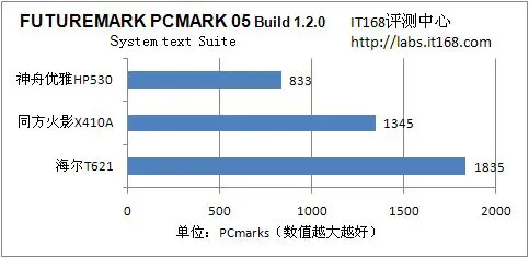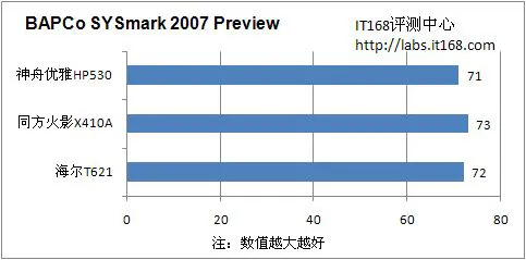 我们从测试表格中可以看到,在SYSmark07的测试中,三款产品的最终成绩为72、73和71,整机性能处于同一水平线上,均能够满足一般用户的需求。在3DMark06和PCMark 05的测试中,这三款产品基本上是配置较高的产品表现略好于配置较低的产品,其中配备了NVIDIA GeForce 9300M GS显卡的海尔T621得分最高,其次为配备了ATI Mobility Radeon HD 2400显卡的清华同方火影X410A,最后为采用GMA X4500HD集显的神舟HP530。不过这三款机型中在3DMark06中表现最好的海尔T621成绩也不过为1835分,要以全效果运行最新的3D游戏还是比较困难的。