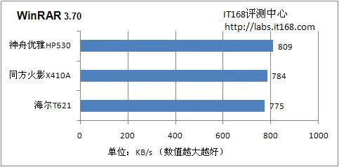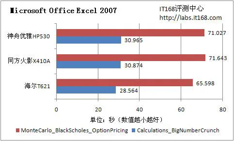 这几项测试中比较倚重CPU和内存的性能,我们从中也能了解到T3200处理器的性能表现。从测试表格中我们可以看到三款产品的成绩相差不大,不过T3200处理器相比起酷睿2系列处理器还是有一定的差距。在WinRAR的测试中,神舟优雅HP530的表现稍好于其他两款产品,有些让我们感到意外。而在Excel 2007的两项测试中,海尔T621使用的时间最短,但和其余两款产品相差不多。