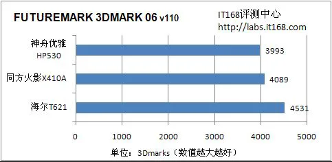 3DMark06均针对笔记本电脑在D3D方面的性能表现测试,我们运行其中的GameTest,记录系统在1024*768*32Bit时与640*480*16Bit时的测试成绩。测试得分越高越好。