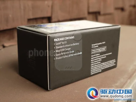包装盒左侧是LG Lucid的包装清单说明,包括LG Lucid手机、电池、数据线、充电器以及说明书等。