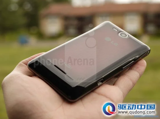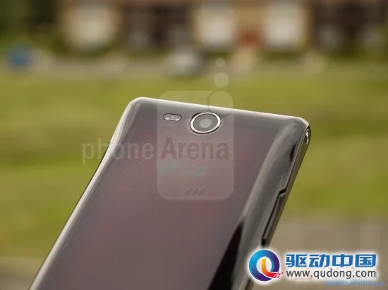 下面,我们再来看看机身的背面。机身背面的设计非常出乎意料,该机没有采用LG中高端手机中常见的纯平式设计,而是带有一定的弧度,并且采用了钢琴烤漆工艺,使后壳看起来更具质感更亮眼,不过容易留下指纹的问题是不能避免的了。