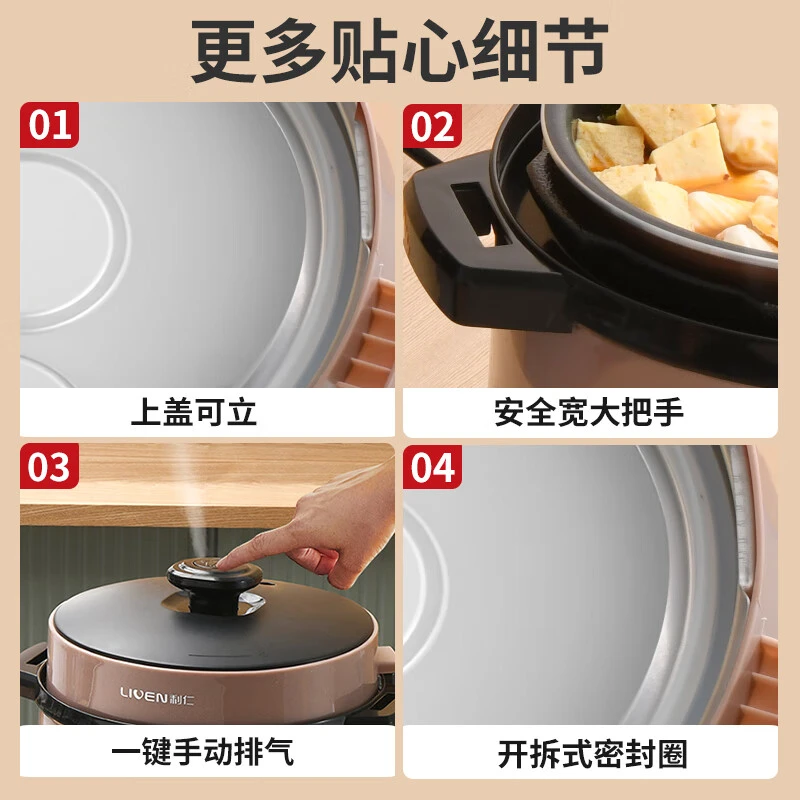 7重安全保护功能,包括开合盖保护、防堵压力、温度限压、卸压超温等,全方位保障你的烹饪安全。可拆卸密封圈和清洗便捷的內盖,让你在清洁时更加方便。