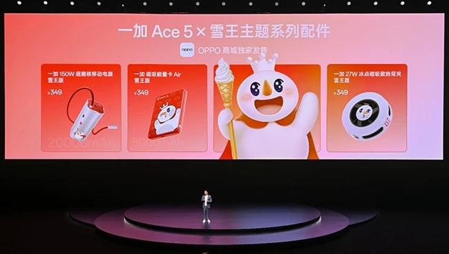 一加 Ace 5 至尊系列还联合蜜雪冰城推出了雪王主题系列配件,包括150W超能核动电源雪王版、磁吸能量卡Air雪王版、27W冰点磁吸散热背夹雪王版等产品,售价均为349元,将在OPPO商城独家发售。