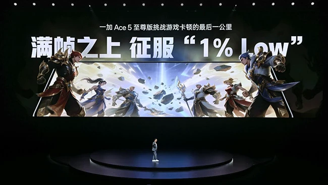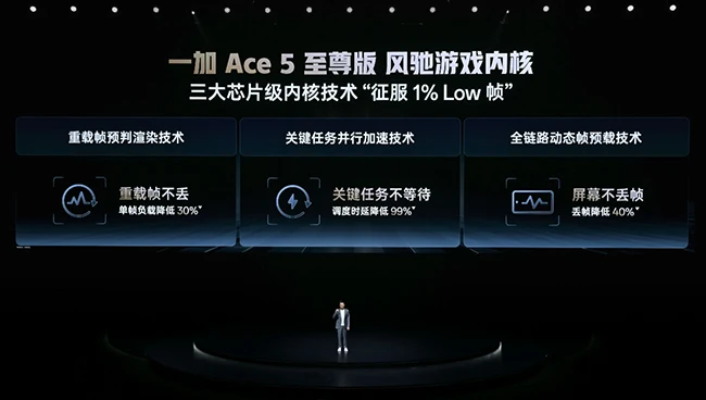 为解决"平均帧率接近满帧但游戏仍卡顿"的手游体验痛点,一加将PC级游戏评测标准1% Low帧纳入手机游戏体验的衡量标准中。1% Low 帧指的是把一段游戏的帧数从高到低排序,取到最低的 1% 帧的帧率平均值。虽然 1% Low 帧出现的时间很短,但它往往出现在团战激烈时刻、钢枪对决瞬间、Boss 战等游戏关键时刻,对于整局游戏的流畅体验至关重要。1%Low帧是最能反映游戏真实流畅度的帧率指标,所以真正的流畅游戏体验,既要看「平均帧率」,更要看「 1% Low 帧」。一加Ace 5 至尊版在平均帧率满帧之上,得益于三大芯片内核技术,继续征服1%Low帧,挑战消灭游戏卡顿的最后一公里。在《王者荣耀》10v10 龙坑团战、《星铁》大规模地图奔跑测试和《原神》血战 Boss 等重载游戏场景中,一加Ace 5 至尊版1%Low帧表现均可挑战行业最强。行业内只有一加Ace 5 至尊版才能同时做到平均帧率行业最高,1%Low帧行业最优。