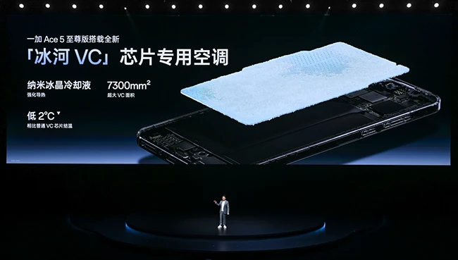 为了芯片性能的强劲释放,一加 Ace 5 至尊版搭载全新「冰河散热系统」,带来高达 41875mm² 的超大散热面积,覆盖整机关键区域。它搭载行业首发纳米冰晶冷却液的「冰河 VC」,瞬时直降芯片温度,堪比芯片专用空调,确保性能释放更持久。同时,全新「冰河石墨」散热能力提升 36%,热导率接近理论极限,均热性能翻倍升级。为了进一步提升散热表现,还搭载全新「冰河电池后盖」,主动辅助散热,长时间握持依然清爽不烫手。在多项旗舰散热技术加持下,一加 Ace 5 至尊版即使面对超重载游戏,也能实现超过 5 小时的满帧高能运行,帧率稳定,温控优秀,带来真正不降频、不掉帧的流畅游戏体验。