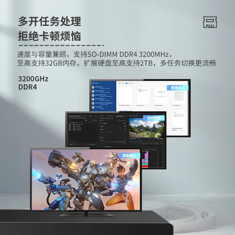 对于目标用户的相关痛点,至本MX-JB375电脑主机也给出了很好的解决方案。它支持SO-DIMM DDR4 3200MHz内存,最高支持32GB,同时还支持扩展硬盘至2TB,多任务切换更加流畅,让你在工作和娱乐时都能享受到高速的体验。