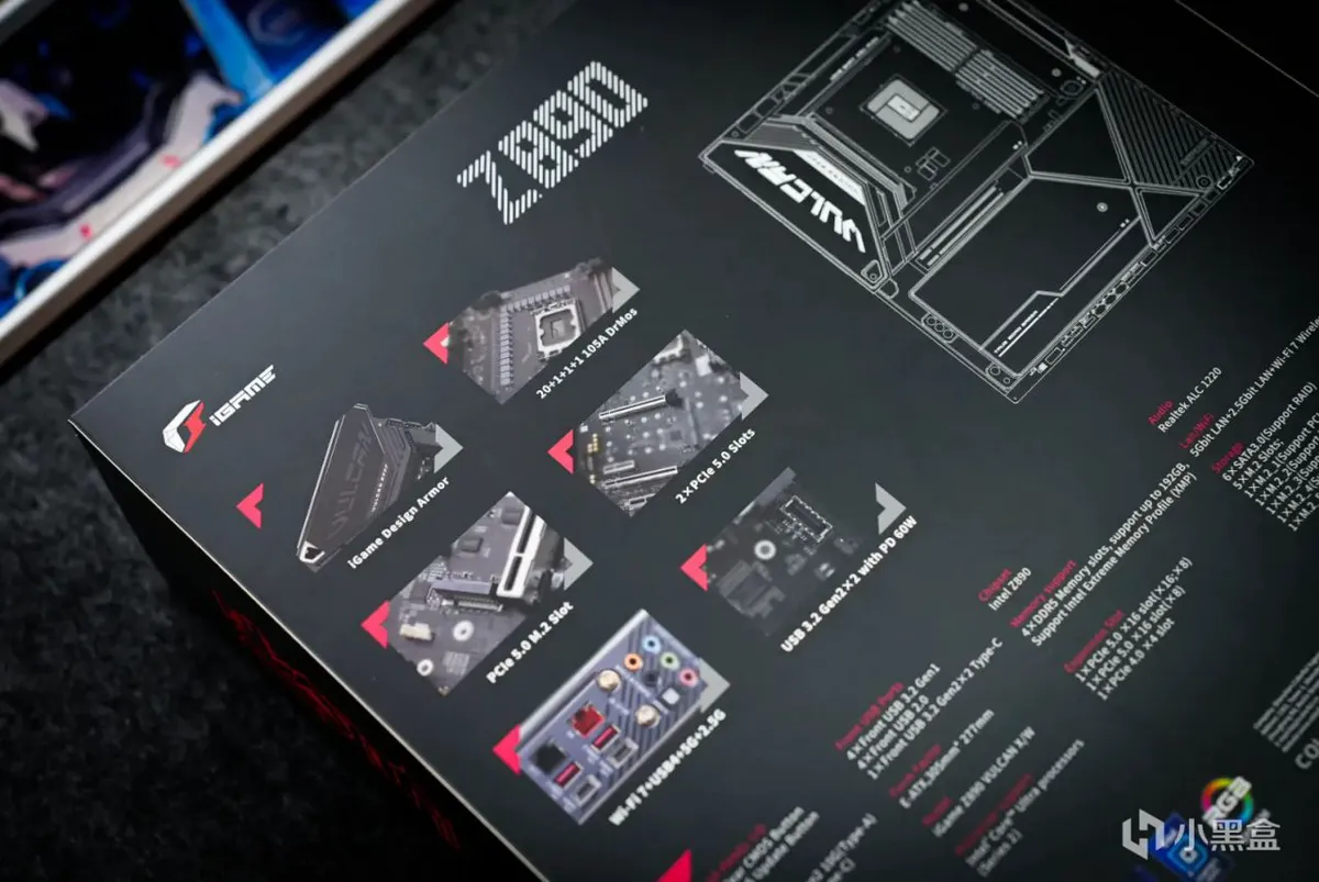 背面则是注明了七彩虹Z890白火神的一系列卖点和硬件参数。比如散热装甲、供电单元、M.2接口、支持WiFi 7+60W PD Type-C接口等等。